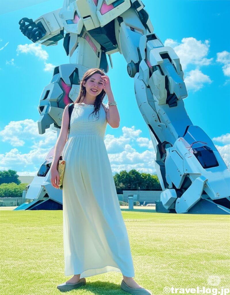 Gundamの巨大な存在感に負けず、でも調和する笑顔。服の揺れ方、光の当たり具合、影の長さ。