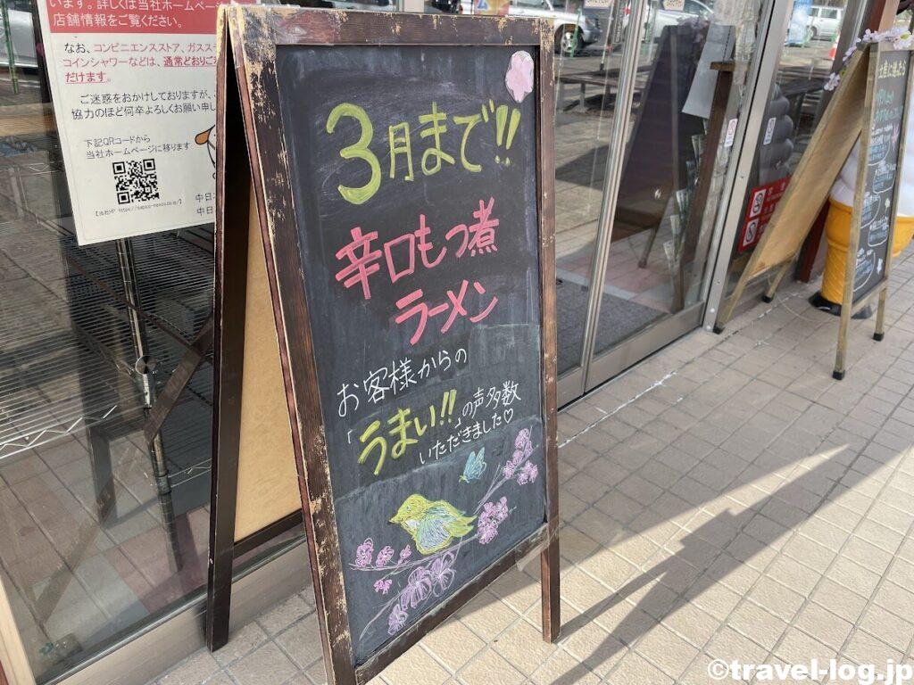 入口に3月まで!!辛口もつ煮ラーメン お客様からの「うまい!!」の声多数いただきました!だと??
