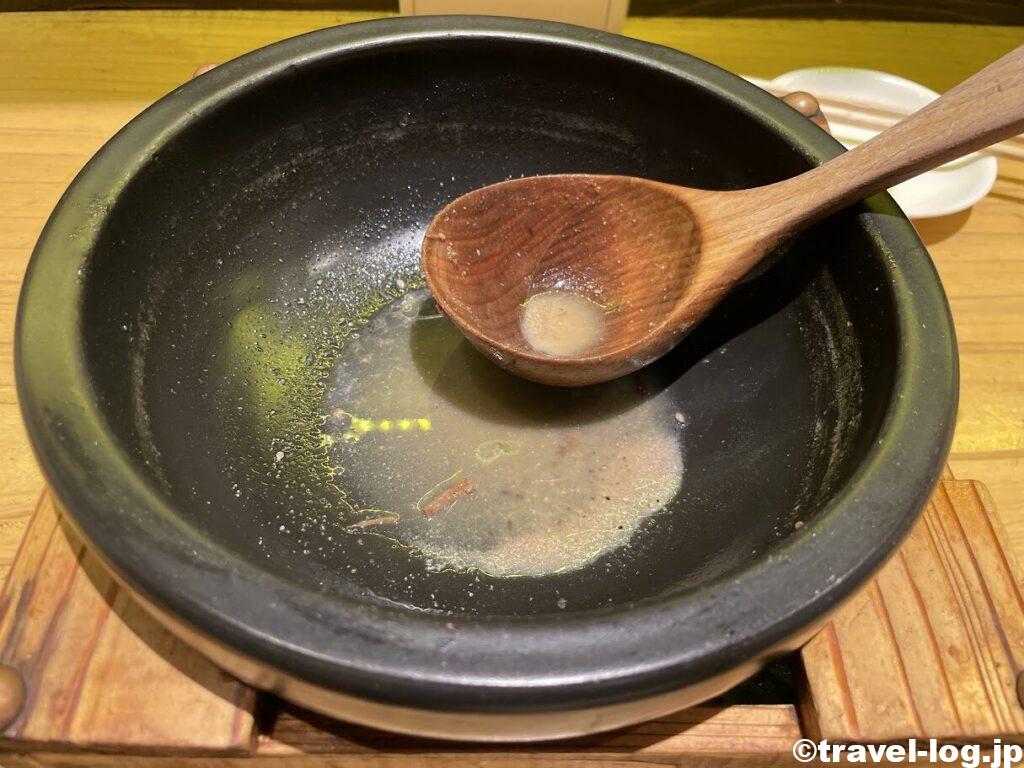 レンゲに入っていたお肉を、スープに放って持ち上げる