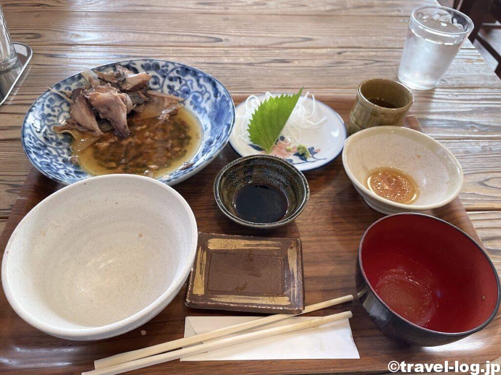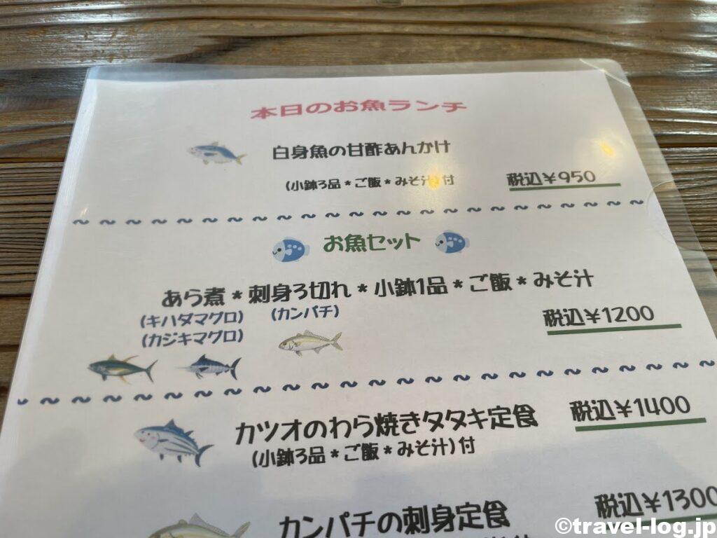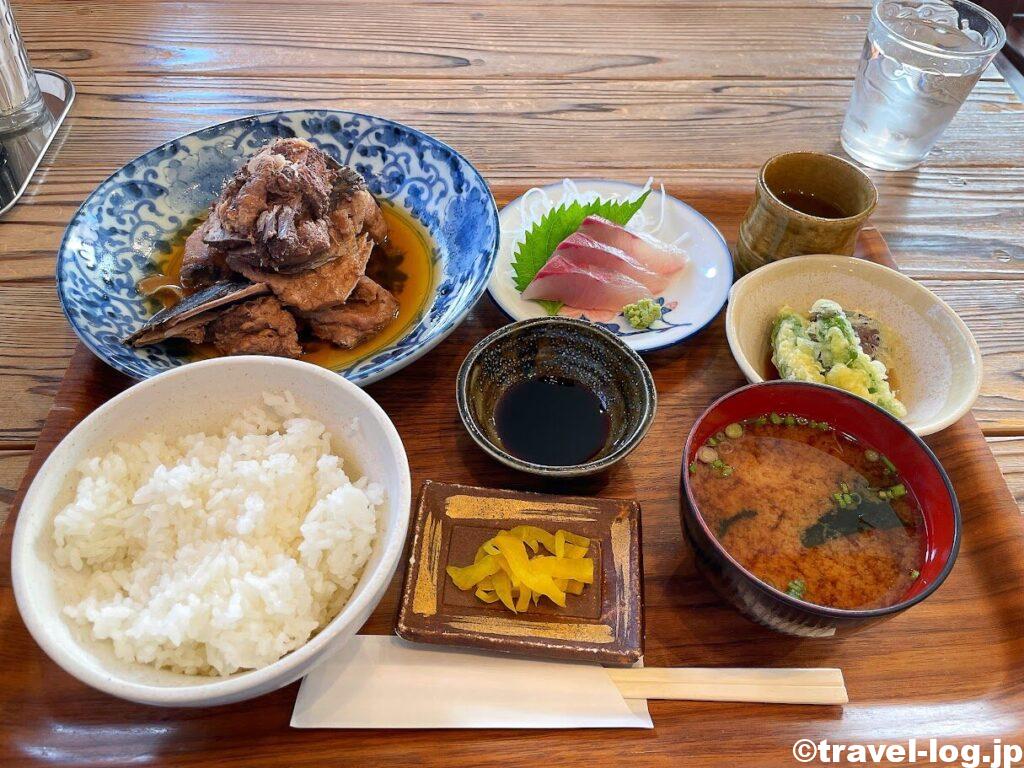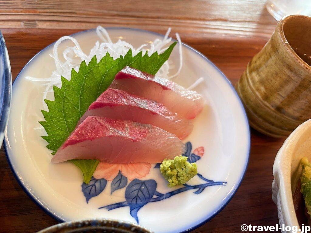 海を堪能したいから、お魚セット(あら煮・刺身3切れ・小鉢1品・ご飯・みそ汁)のセットで刺身はかんぱちに決めた