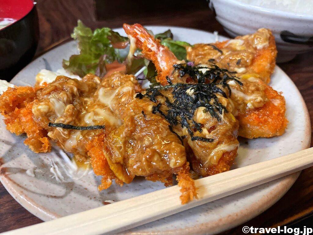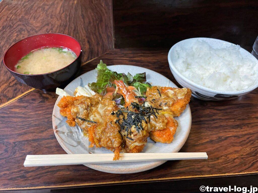 ロースとんかつ定食とどちらにしようか一応迷ってみても、やっぱり1番人気という「三角物語定食」に箸は動いた