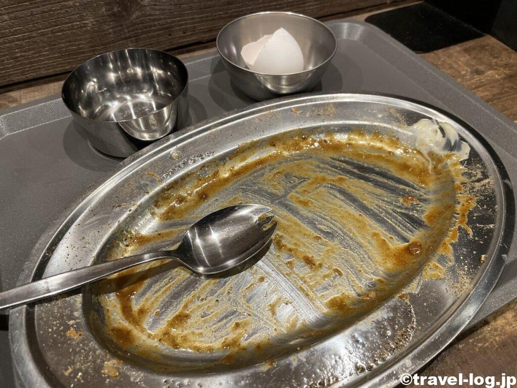 生たまごの黄身を上に乗っけて、白身をカレーに注ぎ込む