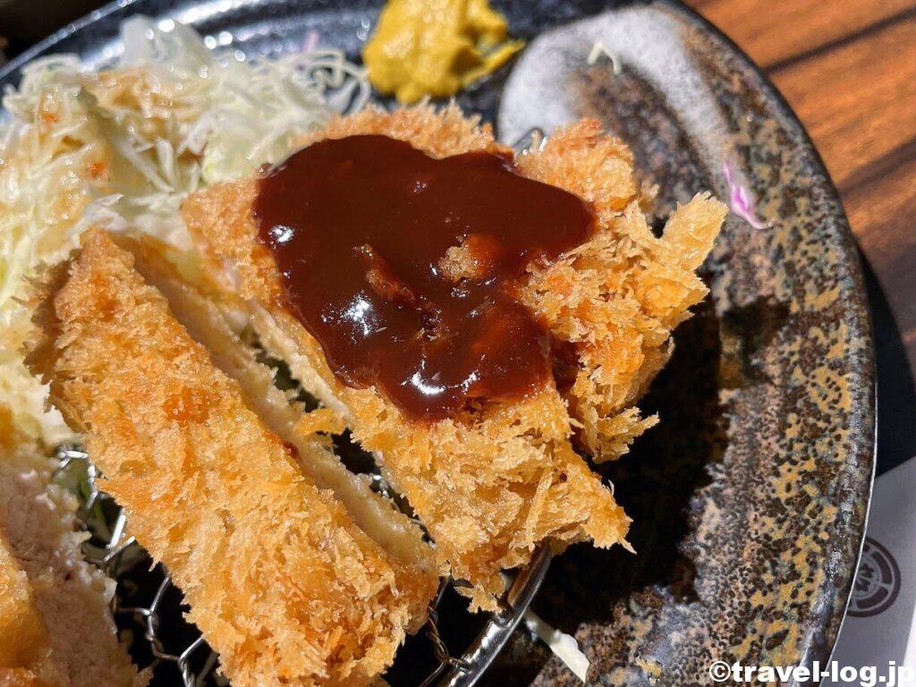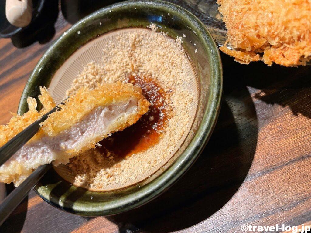 さっそく胡麻と和風ソースの中にカツを沈めて口の中に入れる