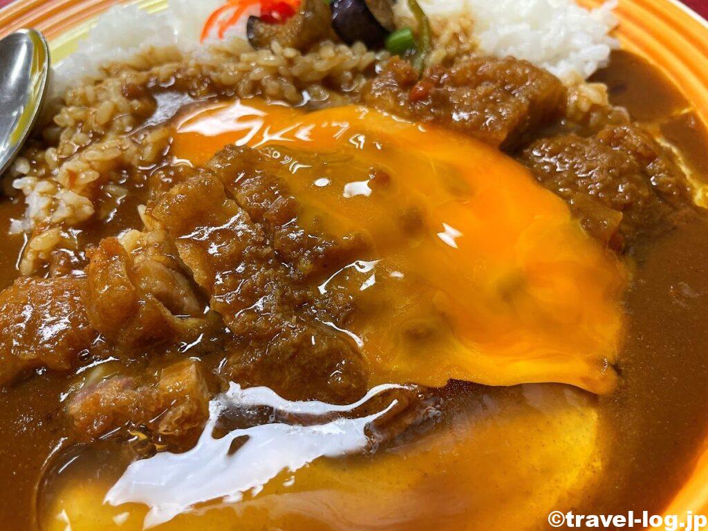 そして、生たまごの黄身を切り離し、カレーの山頂に乗せて、残りはカレーの海にリリース