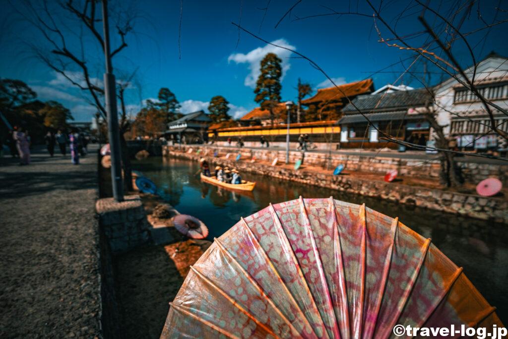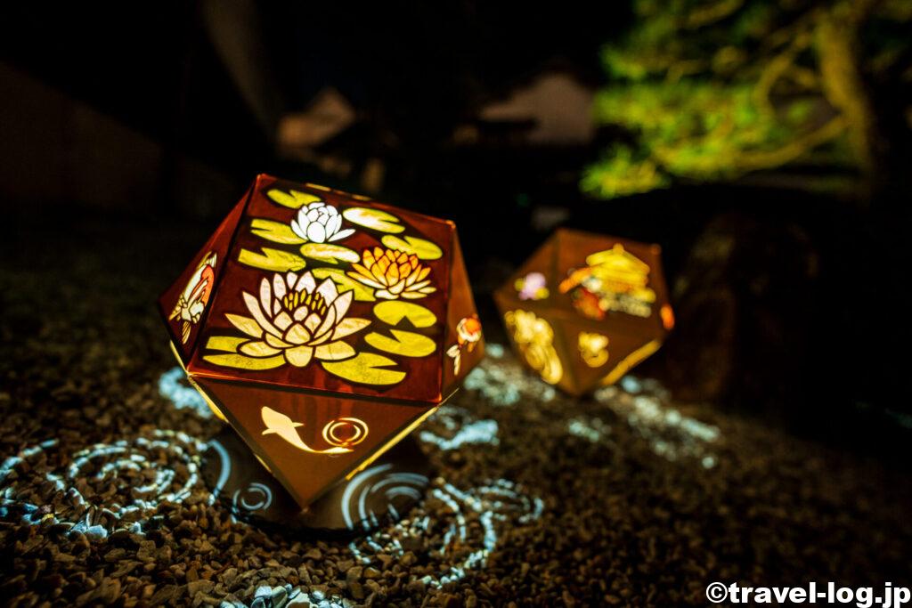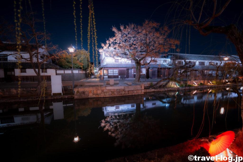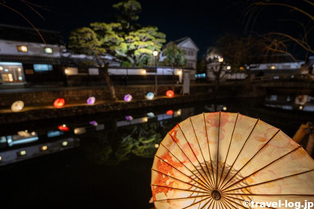 丁度、色とりどりの傘が川辺に配置されていて、それがライトアップされているんだ