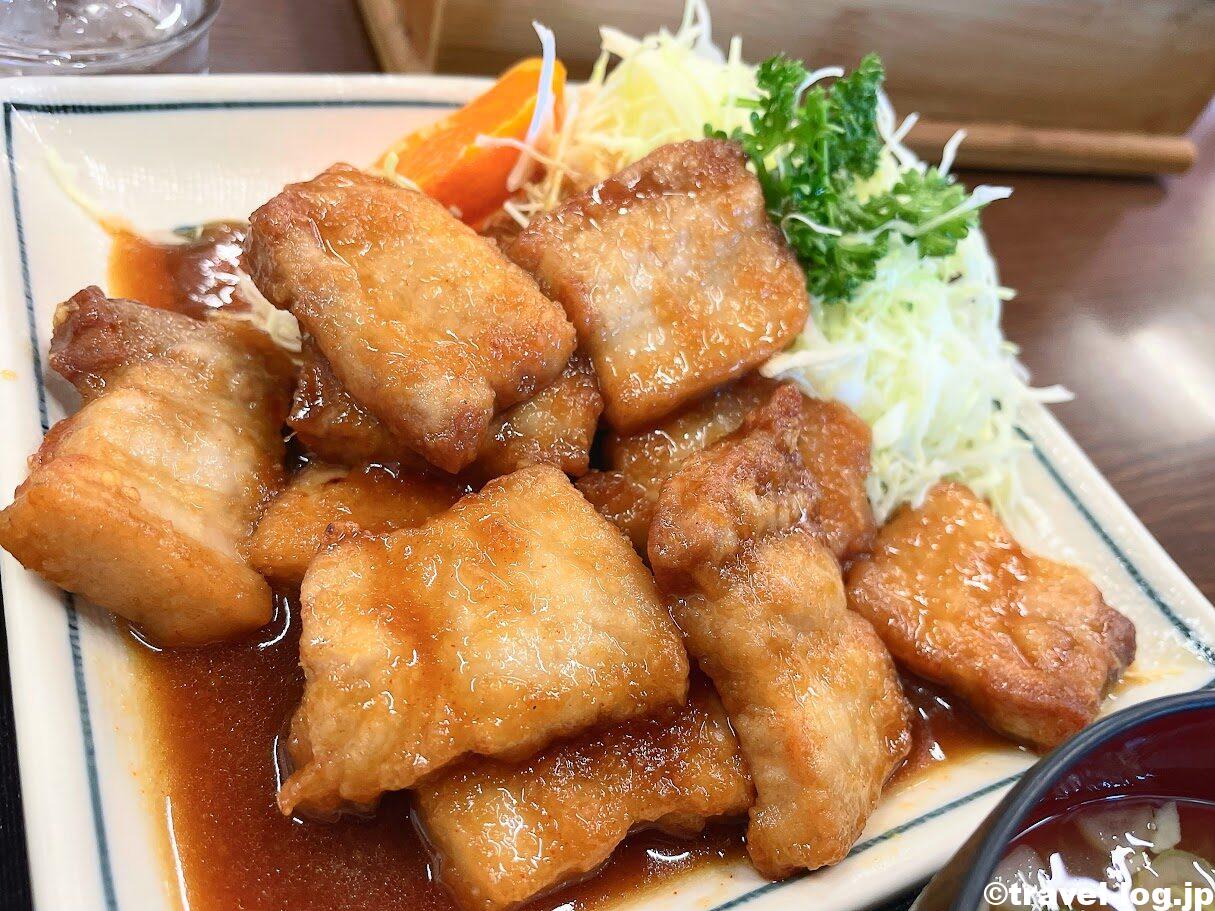 生姜にニンニクソースで、豚バラがコーティングされもうとっても美味しいお肉に昇華
