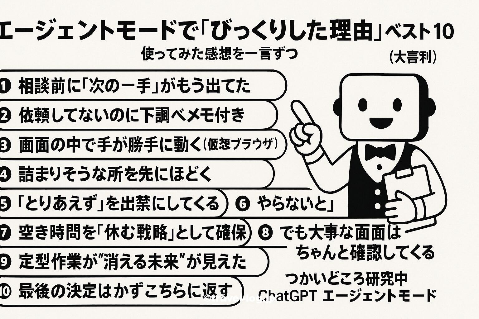 途中の話をはしょりますが、ChatGPT新機能「エージェントモード」を使ってみたちょっとしか使っていないが、これがいろいろ可能性を秘めていると思ったんだ 大喜利 ChatGPT新機能「エージェントモード」を使ってみて、びっくりしたなぜびっくりしたか解説してください ChatGPT新機能「エージェントモード」という機能がリリースされて、どんな機能を持っているのかわからないので、とりあえずO3に聞いてみたんだ 大喜利回答 前向きに言えば――「エージェントモード」は**“会話するAI”から“仕事を任せられるAI ...