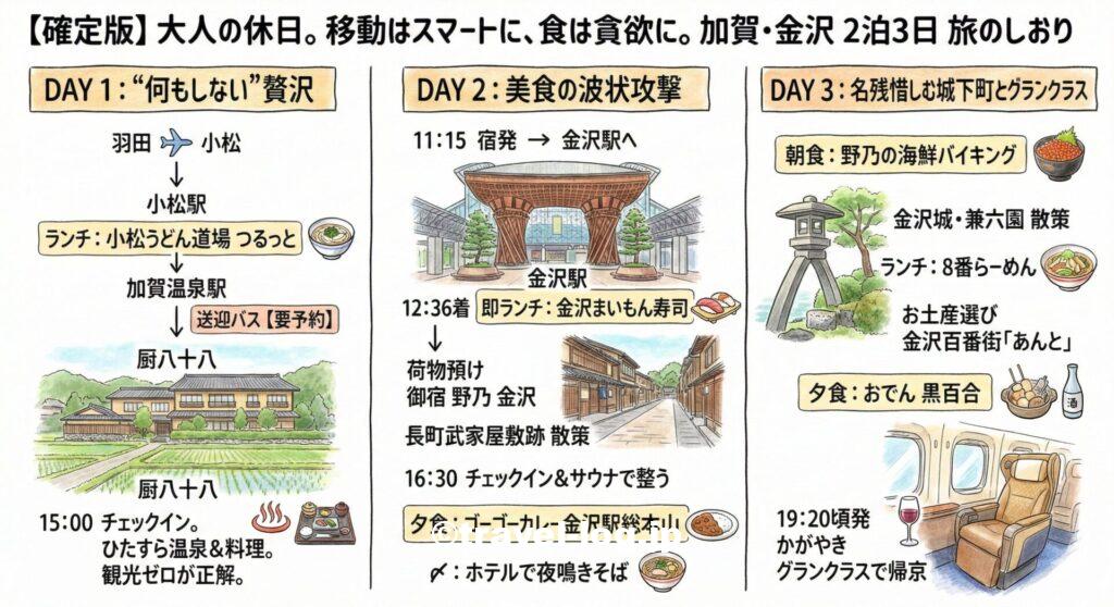 今回は、羽田から小松・山中温泉へ入り、金沢で食い倒れて帰る、最高にメリハリの効いた2泊3日のモデルコースを共有します。